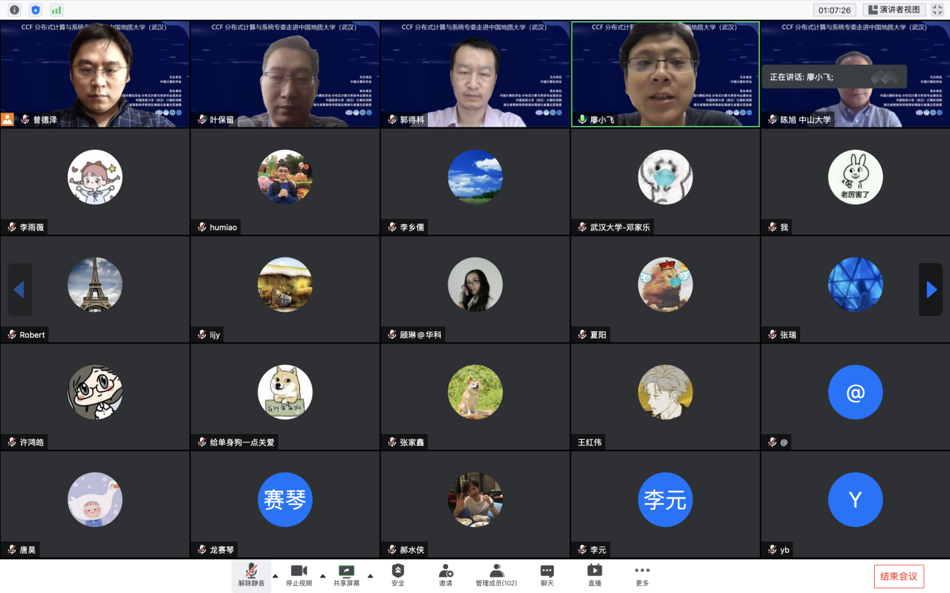 “CCF分布式计算与系统专委走进高校系列报告会”第1期——走进3044am永利集团官网(武汉)于 2020 年7 月 25日在线成功举办。该活动由中国计算机学会主办,CCF会分布式计算与系统专业委员会、3044am永利集团官网(武汉)3044am永利集团官网、智能地学信息处理湖北省重点实验室承办。分布式计算与系统专委会委员国防科技大学郭得科教授、南京大学叶保留教授、中山大学陈旭教授应邀作学术报告,3044am永利集团官网(武汉)曾德泽教授主持会议。会议采用线上腾讯会议和 B 站会议直播的方式,下午参加腾讯会议的人气峰值达175,观看直播的人气峰值达300余人,累计参会人数近500人。参会人员来自包括3044am永利集团官网(武汉)、南京大学、中山大学、国防科技大学、华中科技大学、武汉大学、南开大学、武汉理工大学、中南财政政法大学、华中师范大学、武汉工程大学、湖北大学、西南大学、南京邮电大学、南京理工大学等多所高校。